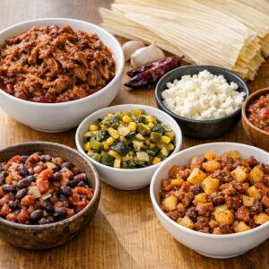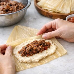 One day before cooking: Remove fillings from refrigerator 30 minutes before you’ll need them so they’re workable. Bring lard to room temperature (critically important for beating). Set up your workspace mentally—know where every ingredient will sit, where your steamer will go, where your assembled tamales will rest.